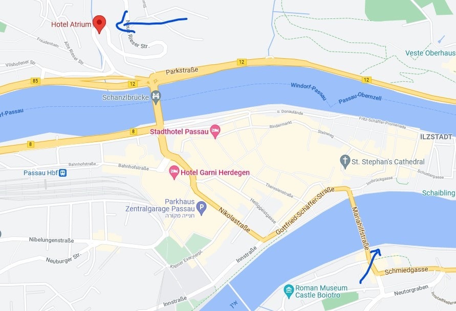 לפני כן, כשעברנו בשארדינג Scharding קיבלנו את האופניים, את התיקים ואת ההסברים, והמשכנו לפסאו, למלון Atrium.